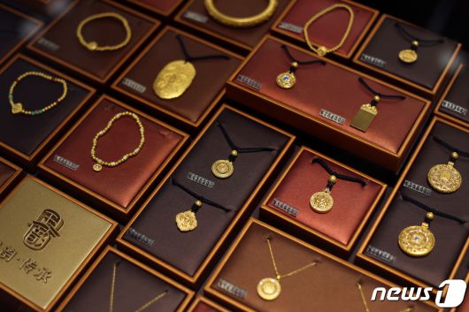 상하이의 차우타이푹 보석 매장에 전시된 골드 주얼리 ⓒ 로이터=뉴스1 |