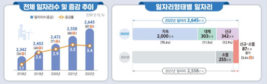 6일 통계청이 발표한 ‘2022년 일자리행정통계 결과’에 따르면 지난해 연간 일자리는 2645만개로 전년보다 87만개(3.4%) 증가한 것으로 나타났다.