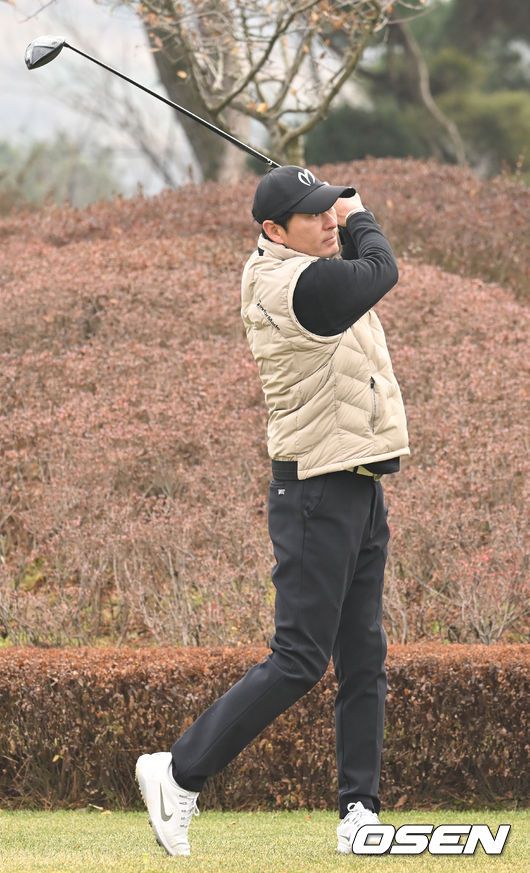 [OSEN=이천, 김성락 기자] 6일 오전 경기도 이천시 H1 클럽에서 제40회 KBO 야구인 골프대회가 열렸다. NC 강인권 감독이 티샷을 하고 있다. 2023.12.06 / ksl0919@osen.co.kr
