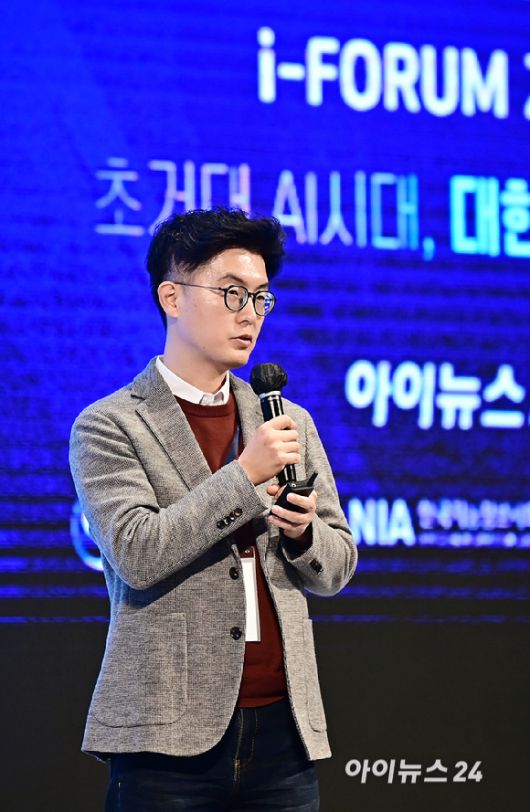 [아이뉴스24 곽영래 기자]'챗GPT' 등장과 함께 AI 시대가 성큼 다가온 가운데 관련 산업의 현재와 미래를 살펴볼 수 있는 '아이포럼 2023'이 '초거대 AI 시대, 대한민국의 미래'라는 주제로 6일 서울 용산구 드래곤시티 호텔 3층 한라홀에서 열렸다. 황재선 SK디스커버리·SK바이오사이언스 부사장이 강연을 하고 있다.