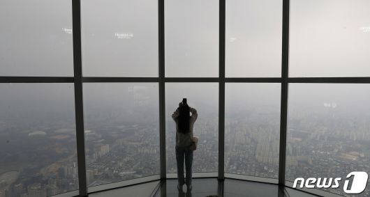(서울=뉴스1) 박세연 기자 = 서울 미세먼지 농도가 ‘나쁨’을 보이고 있는 6일 오후 서울 송파구 롯데월드타워 서울스카이를 찾은 시민이 미세먼지와 흐린 날씨로 뿌옇게 보이는 서울도심을 바라보고 있다. 2023.12.6/뉴스1