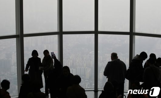 (서울=뉴스1) 박세연 기자 = 서울 미세먼지 농도가 ‘나쁨’을 보이고 있는 6일 오후 서울 송파구 롯데월드타워 서울스카이를 찾은 시민들이 미세먼지와 흐린 날씨로 뿌옇게 보이는 서울도심을 바라보고 있다. 2023.12.6/뉴스1psy5179@news1.krCopyright ⓒ 뉴스1. All rights reserved. 무단 전재 및 재배포, AI학습 이용 금지.