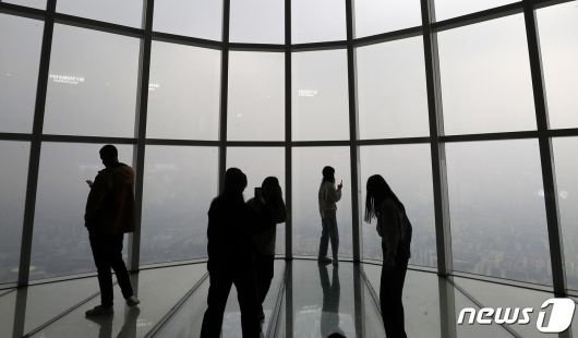 (서울=뉴스1) 박세연 기자 = 서울 미세먼지 농도가 ‘나쁨’을 보이고 있는 6일 오후 서울 송파구 롯데월드타워 서울스카이를 찾은 시민들이 미세먼지와 흐린 날씨로 뿌옇게 보이는 서울도심을 바라보고 있다. 2023.12.6/뉴스1