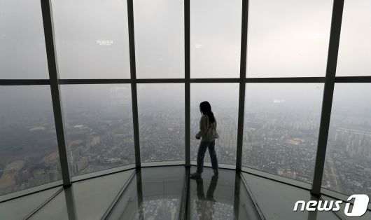 (서울=뉴스1) 박세연 기자 = 서울 미세먼지 농도가 ‘나쁨’을 보이고 있는 6일 오후 서울 송파구 롯데월드타워 서울스카이를 찾은 시민이 미세먼지와 흐린 날씨로 뿌옇게 보이는 서울도심을 바라보고 있다. 2023.12.6/뉴스1