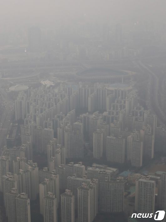 (서울=뉴스1) 박세연 기자 = 서울 미세먼지 농도가 ‘나쁨’을 보이고 있는 6일 오후 서울 송파구 롯데월드타워 서울스카이에서 바라본 강남구 서울도심이 미세먼지와 흐린 날씨로 뿌옇게 보이고 있다. 2023.12.6/뉴스1