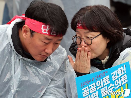 (서울=뉴스1) 김진환 기자 = 양경수 민주노총 위원장과 나순자 전국보건의료산업노동조합 위원장(오른쪽)이 6일 오후 서울 영등포구 여의도 국회 앞에서 열린 결의대회에서 대화를 나누고 있다. 2023.12.6/뉴스1kwangshinQQ@news1.krCopyright ⓒ 뉴스1. All rights reserved. 무단 전재 및 재배포, AI학습 이용 금지.