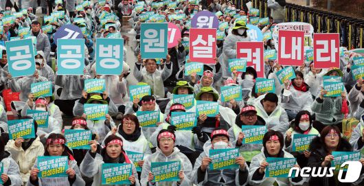 (서울=뉴스1) 김진환 기자 = 전국보건의료산업노동조합 조합원들이 6일 오후 서울 영등포구 여의도 국회 앞에서 열린 결의대회에서 정부의 공공의료 강화 및 의료진 확충, 회복기 지원 확대 등을 촉구하고 있다. 2023.12.6/뉴스1