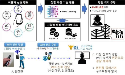 예컨대 과기정통부와 경찰청이 개발한 긴급구조 정밀측위 기술은 휴대전화가 감지하는 다양한 네트워크 신호정보(와이파이, 기지국 정보 등)를 활용해 다층 건물 내에 있는 구조요청자 위치를 신속히 추정할 수 있다. 이후 구체적인 위치는 현장에 출동한 경찰이 소유한 이동형 와이파이 송신기를 활용해 와이파이 신호를 피해자 스마트폰이 수신시켜 추정한다.