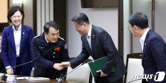 (세종=뉴스1) 김기남 기자 = 방기선 국무조정실장(오른쪽 두번째)이 6일 오후 세종시 정부세종청사에서 열린 외청장 회의에 참석하며 남화영 소방청장과 인사를 나누고 있다. 2023.12.6/뉴스1kinam@news1.krCopyright ⓒ 뉴스1. All rights reserved. 무단 전재 및 재배포, AI학습 이용 금지.