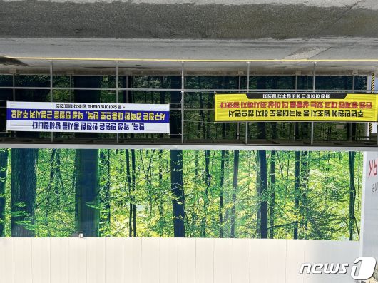 현수막에는 '반복·악성민원은 안전한 공사를 방해합니다', '살집을 잃은 우리 입주예정자들이 피해자다', '공사가 하루만 지연돼도 피가 마른다' 등의 문구가 담겼다.