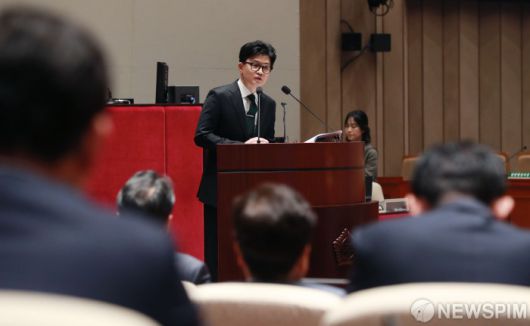 [서울=뉴스핌] 이형석 기자 = 한동훈 법무부 장관이 6일 오후 서울 여의도 국회에서 열린 국민의힘 정책의원총회에서 ‘출입국 이민관리청 신설 방안’에 대해 제안설명을 하고 있다. 2023.12.06 leehs@newspim.com