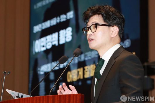 [서울=뉴스핌] 이형석 기자 = 한동훈 법무부 장관이 6일 오후 서울 여의도 국회에서 열린 국민의힘 정책의원총회에서 ‘출입국 이민관리청 신설 방안’에 대해 제안설명을 하고 있다. 2023.12.06 leehs@newspim.com