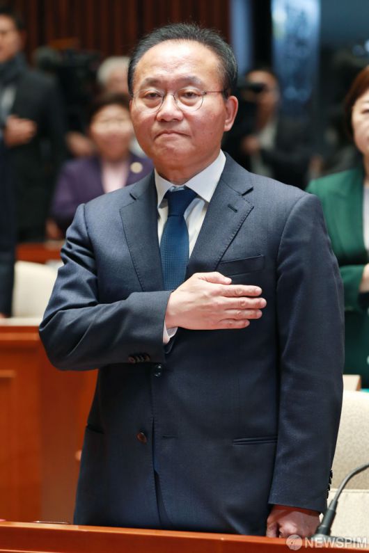 [서울=뉴스핌] 이형석 기자 = 윤재옥 국민의힘 원내대표가 6일 오후 서울 여의도 국회에서 열린 정책의원총회에서 국민의례를 하고 있다. 2023.12.06 leehs@newspim.com 저작권자(c) 글로벌리더의 지름길 종합뉴스통신사 뉴스핌(Newspim), 무단 전재-재배포 금지