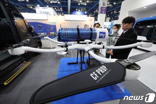 (서울=뉴스1) 신웅수 기자 = 6일 서울 강남구 코엑스에서 열린 2023 대한민국 산업기술 연구개발(R&D) 대전을 찾은 관람객들이 액화수소로 작동하는 수소 연료 전지 드론을 살펴보고 있다. 오는 8일까지 열리는 이번 행사는 한국 산업 기술 발전의 역사를 돌아보고 향후 발전 방향을 모색하기 위해 마련됐다. 2023.12.6/뉴스1