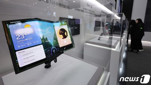 (서울=뉴스1) 신웅수 기자 = 6일 서울 강남구 코엑스에서 열린 2023 대한민국 산업기술 연구개발(R&D) 대전을 찾은 관람객들이 삼성디스플레이의 멀티 폴더블 디스플레이를 살펴보고 있다. 오는 8일까지 열리는 이번 행사는 한국 산업 기술 발전의 역사를 돌아보고 향후 발전 방향을 모색하기 위해 마련됐다. 2023.12.6/뉴스1