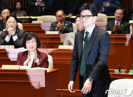 (서울=뉴스1) 송원영 기자 = 한동훈 법무장관이 6일 서울 여의도 국회에서 열린 국민의힘 정책의원총회에 참석하고 있다. 2023.12.6/뉴스1