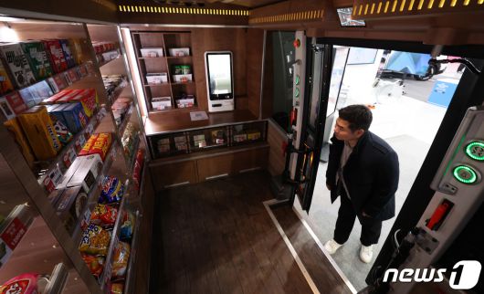 (서울=뉴스1) 신웅수 기자 = 6일 서울 강남구 코엑스에서 열린 2023 대한민국 산업기술 연구개발(R&D) 대전을 찾은 관람객이 자율주행 차량 내에 마련된 언택트 편의점을 살펴보고 있다. 오는 8일까지 열리는 이번 행사는 한국 산업 기술 발전의 역사를 돌아보고 향후 발전 방향을 모색하기 위해 마련됐다. 2023.12.6/뉴스1