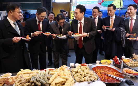 윤 대통령은 시장 내 분식집에 들러 동행한 박형준 부산시장, 엑스포 유치를 위해 노력한 기업 총수들과 함께 떡볶이, 빈대떡, 비빔당면 등을 먹었다.
