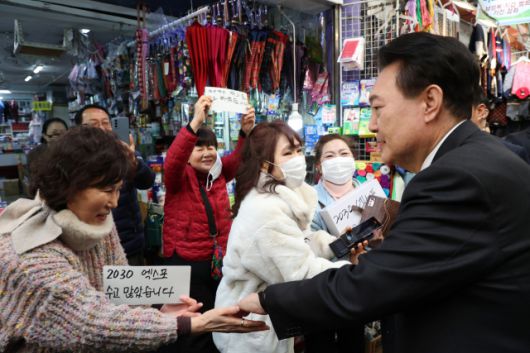 윤석열 대통령이 이재용 삼성전자 회장, 최재원 SK 수석 부회장, 구광모 LG 회장 등과 함께 부산 국제시장을 찾아 시민들과 소통했다. 2030 부산 엑스포 유치 실패에 대한 실망감을 달래기 위한 행보로 보인다. 윤 대통령은 시장 방문에 앞서 부산 북항 컨벤션센터에서 간담회를 열고 엑스포 유치 실패와 무관하게 가덕도 신공항과 북항 재개발, 산업은행 이전 등 부산의 지역 개발 과제를 차질없이 추진하겠다고 밝히기도 했다.