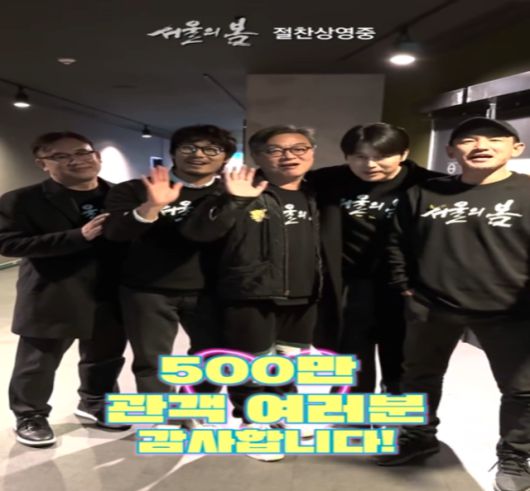 '서울의 봄' 배급사인 플러스엠엔터테인먼트 공식 사회관계망서비스(SNS)에는 "'드디어 500만 관객 돌파. '서울의 봄'과 함께해 주신 관객 여러분들께 감사드립니다"라는 글과 함께 영상이 게재됐다.
