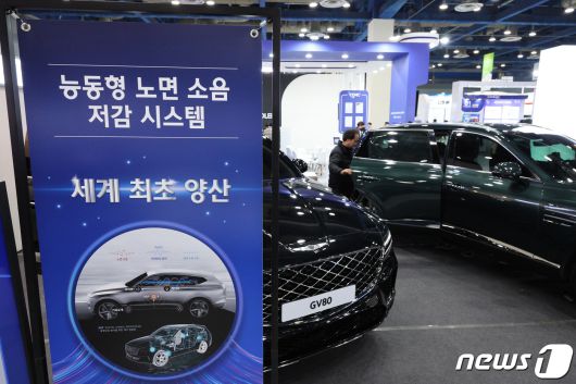 (서울=뉴스1) 신웅수 기자 = 6일 서울 강남구 코엑스에서 열린 2023 대한민국 산업기술 연구개발(R&D) 대전을 찾은 관람객들이 현대자동차의 능동형 노면 소음 저감 시스템이 적용된 차량을 살펴보고 있다. 오는 8일까지 열리는 이번 행사는 한국 산업 기술 발전의 역사를 돌아보고 향후 발전 방향을 모색하기 위해 마련됐다. 2023.12.6/뉴스1
