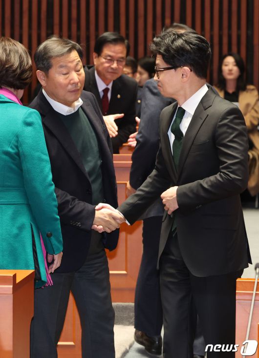 (서울=뉴스1) 송원영 기자 = 이철규 국민의힘 인재영입 위원장과 한동훈 법무장관이 6일 서울 여의도 국회에서 열린 정책의원총회에서 인사를 나누고 있다. 2023.12.6/뉴스1sowon@news1.krCopyright ⓒ 뉴스1. All rights reserved. 무단 전재 및 재배포, AI학습 이용 금지.