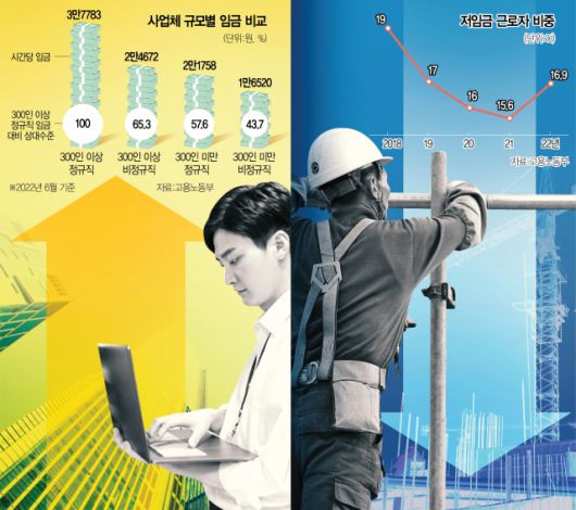 이는 대기업과 중소기업, 정규직과 비정규직 근로자 간 임금 격차를 확대하는 이중구조를 심각하게 한 원인 중 하나로 꼽힌다. 특정 기업의 임금 상승이 다른 기업과의 임금 격차를 벌리는 임금 불평등을 낳고 있는 상황이라는 것이다. 고용부가 올 5월 발표한 고용형태별근로실태조사(2022년 6월 기준)에 따르면 정규직의 시간당 임금을 100으로 봤을 때 비정규직의 임금 수준은 70.6%로 전년보다 2.3%포인트 낮아졌다. 4년 만에 다시 임금 격차가 확대됐다. 근로자 300인 이상 정규직 임금을 100으로 봤을 때 300인 미만 비정규직의 임금 수준은 43.7%에 머무르면서 2019년(42.7%) 수준으로 돌아갔다. 임금 인상이 주목적인 노조에 가입한 비율을 보면 정규직은 13.5%인 반면 비정규직은 0.7%에 그쳤다. 상여금 지급률(예정 포함)도 정규직이 62.8%로 비정규직(24.1%) 대비 3배가량 된다. 더 큰 문제는 저임금 근로자 비중이 16.9%로 9년 만에 증가세로 전환됐다는 점이다. 임금 총량 자체가 적은 저임금 근로자는 지난해부터 이어진 고물가 상황에서 실질임금 감소에 따른 충격이 심한 상황이다.