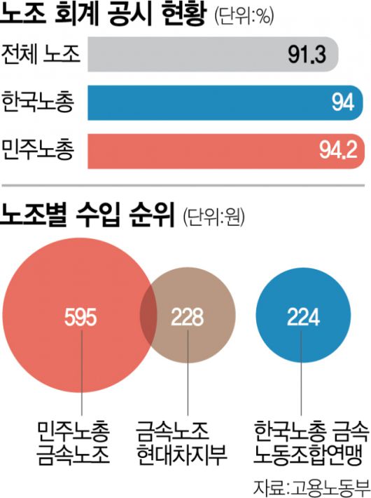 고용부는 올해 노조에 지난해 자산·부채·수입·지출 등 회계 주요 항목을 공시시스템에 등록하도록 한 공시제를 도입했다. 공시를 한 노조에는 조합비 세액공제 혜택을 주는 방식으로 노조들의 참여를 유도했다. 노조 지형을 양분하는 한국노총과 민주노총 가맹 노조의 공시율은 각각 94%, 94.3%로 평균치를 웃돌았다.