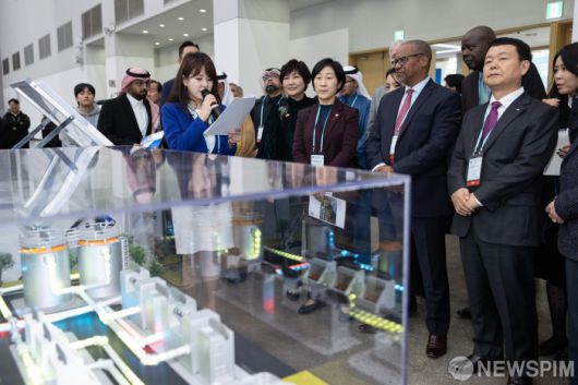 [서울=뉴스핌] 한화진 환경부 장관이 6일 오전 대구 엑스코에서 열린 '대한민국 국제물주간 2023(KIWW 2023)' 행사에 참석해 자카라이아 뭉기 내루 케냐 물위생관개부 장관, 파트릭 커 미국수도협회 회장, 이멧 사치 세계물위원회 이사, 윤석대 한국수자원공사 사장 등 참석자들과 함께 물기업 신기술·제품 전시회를 관람하고 있다.[사진= 환경부 ] 2023.12.06 photo@newspim.com