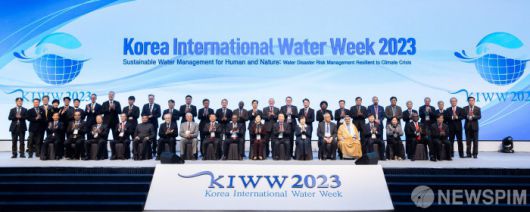 [서울=뉴스핌]한화진 환경부장관이 6일 오전 대구 엑스코에서 열린 '대한민국 국제물주간 2023(KIWW 2023)' 개회식에 참석하여 자카라이아 뭉기 내루 케냐 물위생관개부 장관, 파트릭 커 미국수도협회 회장, 이멧 사치 세계물위원회 이사, 윤석대 한국수자원공사 사장 등 참석자들과 함께 기념촬영을 하고 있다.[사진= 환경부 ] 2023.12.06 photo@newspim.com