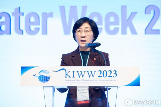 [서울=뉴스핌]한화진 환경부장관이 6일 오전 대구 엑스코에서 열린 '대한민국 국제물주간 2023(KIWW 2023)' 개회식에 참석하여 "세계 각국의 물관리 정책과 기술을 교류하는 공간이 되어 기후 위기 속 물 문제의 실질적인 해결방안을 찾고 대한민국 물산업이 세계로 뻗어나가는 소중한 기회가 되기를 기대한다"고 개회사를 하고 있다.[사진= 환경부 ] 2023.12.06 photo@newspim.com