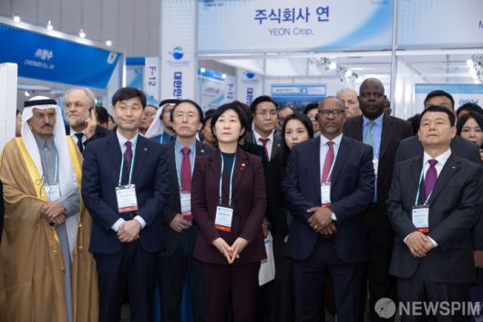 [서울=뉴스핌] 한화진 환경부 장관이 6일 오전 대구 엑스코에서 열린 '대한민국 국제물주간 2023(KIWW 2023)' 행사에 참석해 자카라이아 뭉기 내루 케냐 물위생관개부 장관, 파트릭 커 미국수도협회 회장, 이멧 사치 세계물위원회 이사, 윤석대 한국수자원공사 사장 등 참석자들과 함께 물기업 신기술·제품 전시회를 관람하고 있다.[사진= 환경부 ] 2023.12.06 photo@newspim.com