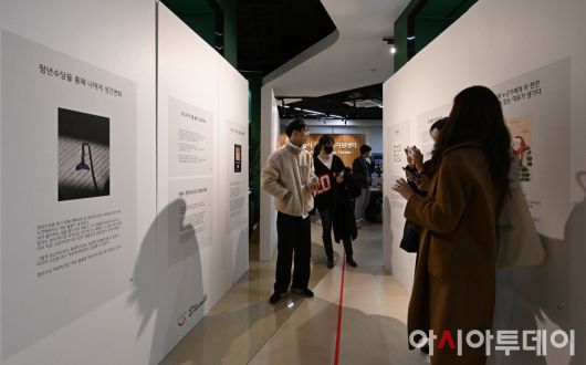 6일 서울 용산구 서울청년활동지원센터에서 열린 '2023 서울 청년수당 성과공유회-어제, 오늘 그리고 내일의 나'에서 참석자들이 청년수당 수기공모 당선작품을 둘러보고 있다. /정재훈 기자