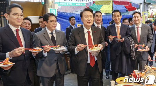 (부산=뉴스1) 부산사진공동취재단 = 윤석열 대통령이 6일 부산 중구 깡통시장을 방문해 박형준 부산시장과 이재용 삼성전자 회장, 구광모 LG그룹 회장, 조현준 효성그룹 회장, 김동관 한화그룹 부회장, 최재원 SK수석부회장 등 기업총수들과 함께 떡볶이, 튀김, 빈대떡을 맛보고 있다. 2023.12.6/뉴스1