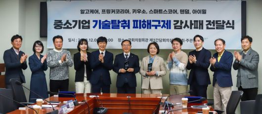 이날 감사패 전달식은 기술 탈취 분쟁을 겪은 알고케어, 프링커코리아, 스마트스코어, 키우소, 텐덤, 아이밀 등 피해 중소기업들이 함께 참여했으며 상생협력 및 분쟁 해결에 노력한 한무경 국민의힘 의원과 김경만 더불어민주당 의원에게 감사패를 전달했다.