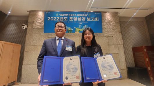 (사진제공=김해시) 김해시가 공공부문 온실가스 감축 최상위 기관에 선정돼 환경부장관 기관상표창(왼쪽 이용규 기후대응과장)과 개인상표창(박세인 주무관)을 수상하고 있다. |