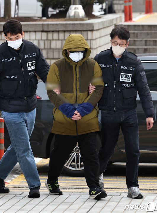 (서울=뉴스1) 구윤성 기자 = 둔기로 아내를 살해한 혐의를 받는 대형 로펌 출신 변호사 A씨가 6일 오후 서울 서초구 서울중앙지방법원에서 열린 구속 전 피의자 심문(영장실질심사)에 출석하고 있다. 검사 출신 전직 다선 국회의원의 아들인 것으로 알려진 A 씨는 지난 3일 오후 7시 50분경 서울 종로구 한 주상복합아파트에서 부부싸움을 하다가 아내를 둔기로 폭행해 결국 사망에 이르게 한 혐의를 받는다. 2023.12.6/뉴스1