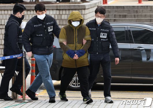 (서울=뉴스1) 구윤성 기자 = 둔기로 아내를 살해한 혐의를 받는 대형 로펌 출신 변호사 A씨가 6일 오후 서울 서초구 서울중앙지방법원에서 열린 구속 전 피의자 심문(영장실질심사)에 출석하고 있다. 검사 출신 전직 다선 국회의원의 아들인 것으로 알려진 A 씨는 지난 3일 오후 7시 50분경 서울 종로구 한 주상복합아파트에서 부부싸움을 하다가 아내를 둔기로 폭행해 결국 사망에 이르게 한 혐의를 받는다. 2023.12.6/뉴스1