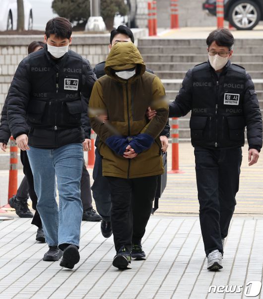 (서울=뉴스1) 구윤성 기자 = 둔기로 아내를 살해한 혐의를 받는 대형 로펌 출신 변호사 A씨가 6일 오후 서울 서초구 서울중앙지방법원에서 열린 구속 전 피의자 심문(영장실질심사)에 출석하고 있다. 검사 출신 전직 다선 국회의원의 아들인 것으로 알려진 A 씨는 지난 3일 오후 7시 50분경 서울 종로구 한 주상복합아파트에서 부부싸움을 하다가 아내를 둔기로 폭행해 결국 사망에 이르게 한 혐의를 받는다. 2023.12.6/뉴스1