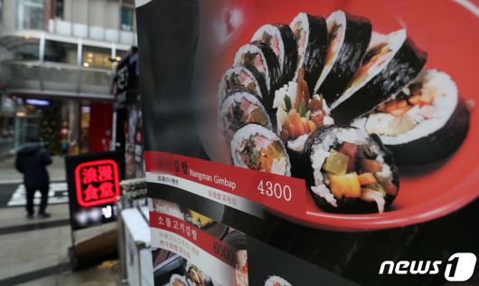 (서울=뉴스1) 이승배 기자 = 11월 소비자물가가 3.3%를 기록하며 넉 달 만에 감소 전환했지만 가공식품 부문 소비자물가지수는 119.48로 작년 같은 기간보다 5.1% 오른 것으로 나타났다. 외식 물가 상승률 역시 4.83%로, 4.77%였던 10월보다 올랐다. 이로써 외식 물가는 30개월, 가공식품 물가는 24개월 연속 전체 물가 상승률을 상회하고 있다. 세부 항목으로 가공식품 중에는 소금이 21.3%, 참기름 20.8% 올랐고, 외식 물가는 햄버거가 16.9%, 김밥 6.9%가 올랐다. 6일 서울 중구 명동의 한 음식점에 입간판이 설치돼 있다. 2023.12.6/뉴스1