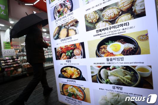 (서울=뉴스1) 이승배 기자 = 11월 소비자물가가 3.3%를 기록하며 넉 달 만에 감소 전환했지만 가공식품 부문 소비자물가지수는 119.48로 작년 같은 기간보다 5.1% 오른 것으로 나타났다. 외식 물가 상승률 역시 4.83%로, 4.77%였던 10월보다 올랐다. 이로써 외식 물가는 30개월, 가공식품 물가는 24개월 연속 전체 물가 상승률을 상회하고 있다. 세부 항목으로 가공식품 중에는 소금이 21.3%, 참기름 20.8% 올랐고, 외식 물가는 햄버거가 16.9%, 김밥 6.9%가 올랐다. 6일 서울 중구 명동의 한 음식점에 입간판이 설치돼 있다. 2023.12.6/뉴스1