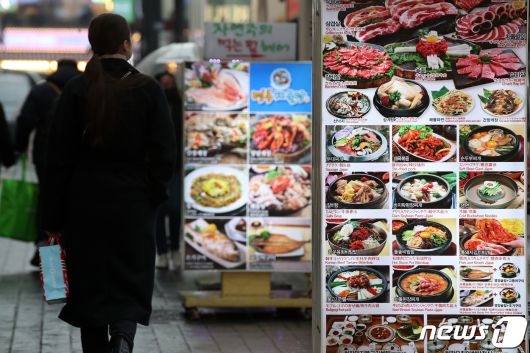 (서울=뉴스1) 이승배 기자 = 11월 소비자물가가 3.3%를 기록하며 넉 달 만에 감소 전환했지만 가공식품 부문 소비자물가지수는 119.48로 작년 같은 기간보다 5.1% 오른 것으로 나타났다. 외식 물가 상승률 역시 4.83%로, 4.77%였던 10월보다 올랐다. 이로써 외식 물가는 30개월, 가공식품 물가는 24개월 연속 전체 물가 상승률을 상회하고 있다. 세부 항목으로 가공식품 중에는 소금이 21.3%, 참기름 20.8% 올랐고, 외식 물가는 햄버거가 16.9%, 김밥 6.9%가 올랐다. 6일 서울 중구 명동의 한 음식점에 입간판이 설치돼 있다. 2023.12.6/뉴스1