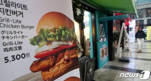 (서울=뉴스1) 이승배 기자 = 11월 소비자물가가 3.3%를 기록하며 넉 달 만에 감소 전환했지만 가공식품 부문 소비자물가지수는 119.48로 작년 같은 기간보다 5.1% 오른 것으로 나타났다. 외식 물가 상승률 역시 4.83%로, 4.77%였던 10월보다 올랐다. 이로써 외식 물가는 30개월, 가공식품 물가는 24개월 연속 전체 물가 상승률을 상회하고 있다. 세부 항목으로 가공식품 중에는 소금이 21.3%, 참기름 20.8% 올랐고, 외식 물가는 햄버거가 16.9%, 김밥 6.9%가 올랐다. 6일 서울 중구 명동의 한 햄버거 매장에 입간판이 설치돼 있다. 2023.12.6/뉴스1