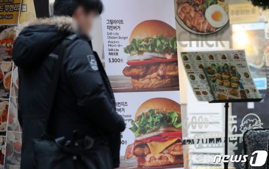 (서울=뉴스1) 이승배 기자 = 11월 소비자물가가 3.3%를 기록하며 넉 달 만에 감소 전환했지만 가공식품 부문 소비자물가지수는 119.48로 작년 같은 기간보다 5.1% 오른 것으로 나타났다. 외식 물가 상승률 역시 4.83%로, 4.77%였던 10월보다 올랐다. 이로써 외식 물가는 30개월, 가공식품 물가는 24개월 연속 전체 물가 상승률을 상회하고 있다. 세부 항목으로 가공식품 중에는 소금이 21.3%, 참기름 20.8% 올랐고, 외식 물가는 햄버거가 16.9%, 김밥 6.9%가 올랐다. 6일 서울 중구 명동의 한 햄버거 매장에 입간판이 설치돼 있다. 2023.12.6/뉴스1