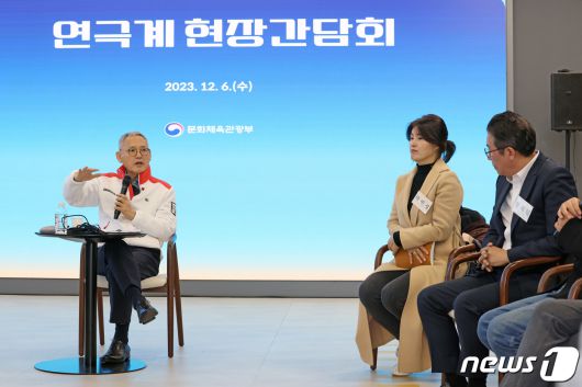 (서울=뉴스1) = 유인촌 문화체육관광부 장관이 6일 서울 서대문구 모두예술극장에서 연극 연출가와 배우를 비롯한 한국연극협회, 한국소극장협회 등 관련 단체장들을 만나 연극계 현안을 논의하고 있다. (문화체육관광부 제공) 2023.12.6/뉴스1photo@news1.krCopyright ⓒ 뉴스1. All rights reserved. 무단 전재 및 재배포, AI학습 이용 금지.