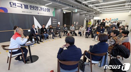 (서울=뉴스1) = 유인촌 문화체육관광부 장관이 6일 서울 서대문구 모두예술극장에서 연극 연출가와 배우를 비롯한 한국연극협회, 한국소극장협회 등 관련 단체장들을 만나 연극계 현안을 논의하고 있다. (문화체육관광부 제공) 2023.12.6/뉴스1photo@news1.krCopyright ⓒ 뉴스1. All rights reserved. 무단 전재 및 재배포, AI학습 이용 금지.