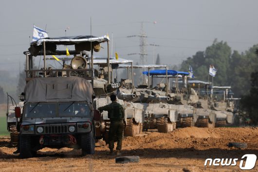 4일(현지시간) 팔레스타인 무장 정파 하마스와 지상전을 개시한 이스라엘 군용 차량이 가자 지구 국경서 이동을 하고 있다. 2023.11.6 ⓒ 로이터=뉴스1 ⓒ News1 우동명 기자 |