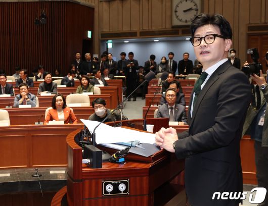(서울=뉴스1) 송원영 기자 = 한동훈 법무장관이 6일 서울 여의도 국회에서 열린 국민의힘 정책의원총회에서 출입국 이민관리청 신설 방안에 대해 설명하고 있다. 2023.12.6/뉴스1
