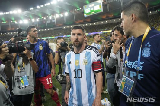 [리우데자네이루=AP/뉴시스] 리오넬 메시 등 아르헨티나 선수들이 21일(현지시각) 브라질 리우데자네이루의 마라카낭 경기장에서 2026 국제축구연맹(FIFA) 북중미 월드컵 남미예선 조별리그 6차전 브라질과 경기가 열리기 전 양국 팬들이 싸움을 벌이자 라커룸으로 들어가고 있다. 이 소요 사태로 경기가 약 30분 지연됐다. 2023.11.22. |