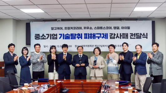 이날 행사는 기술 탈취 분쟁을 겪은 알고케어, 프링커코리아, 스마트스코어, 키우소, 텐덤, 아이밀 등 피해 중소기업들이 함께 참여하여 피해 구제를 위해 분쟁 당사자인 대기업과의 상생협력 및 분쟁 해결에 적극 노력해 준 국민의힘 한무경 의원과 더불어민주당 김경만 의원에게 감사한 마음을 전달하기 위해 마련됐다.